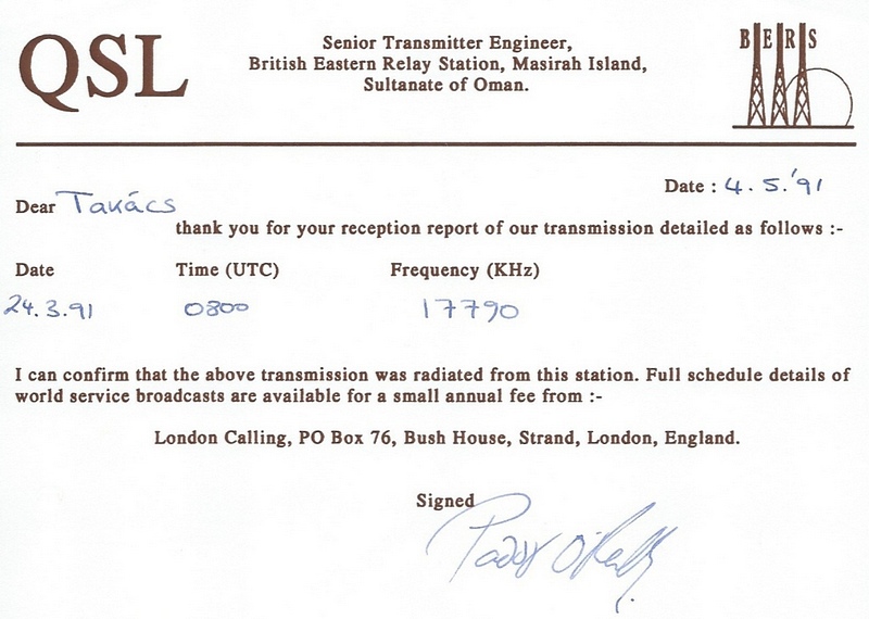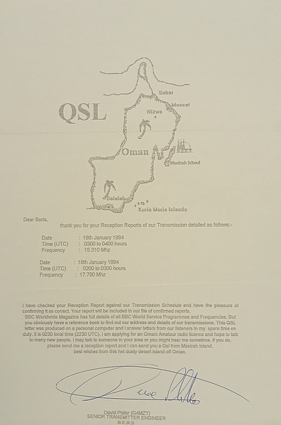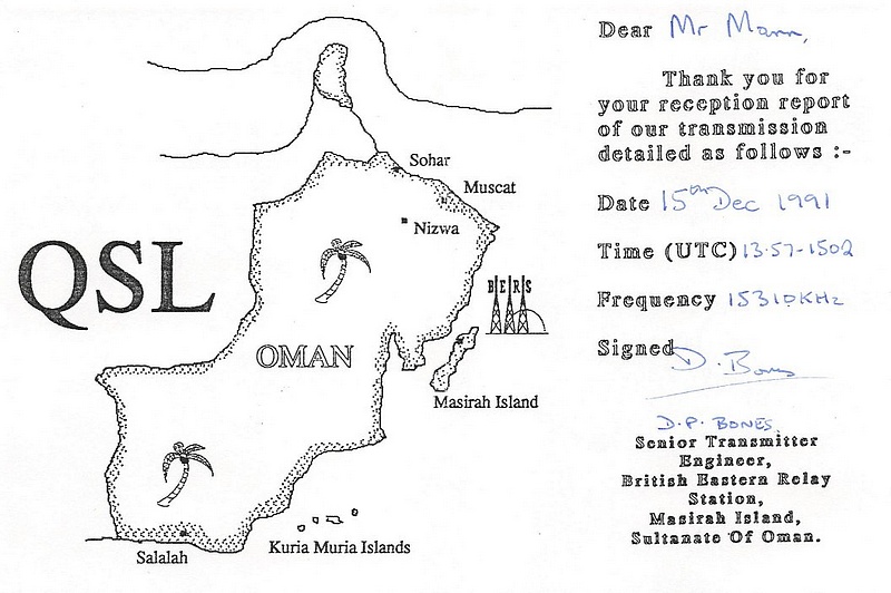 BBC Oman - 1991 ![]() ![]() ![]() QSL Contributed by Carl Mann (USA) BBC Oman - 1991 ![]() QSL Contributed by Rudolf Takacs (Romania)