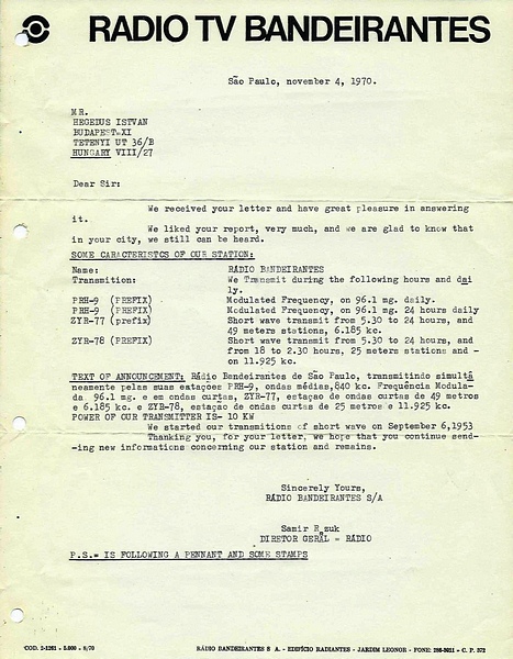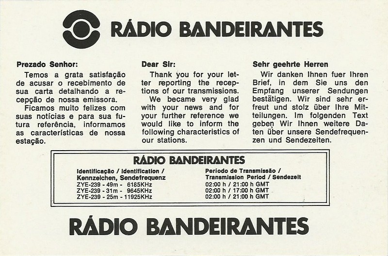 Radio Bandeirantes - 1983 ![]() ![]() QSL Contributed by Istvan Hegedus (Hungary)