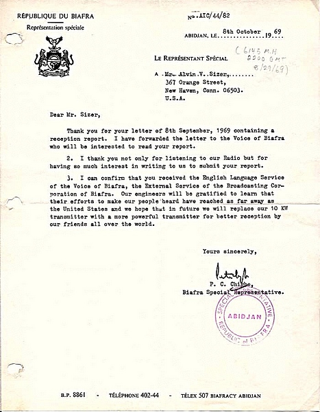 QSL Contributed by Daniel Robinson (USA) Radio Biafra - 1969 QSL Contributed by Michael Mahoney (USA) Radio Biafra - 1969 ![]() Courtesy of “Radio Heritage Foundation, Alvin Sizer” (USA)