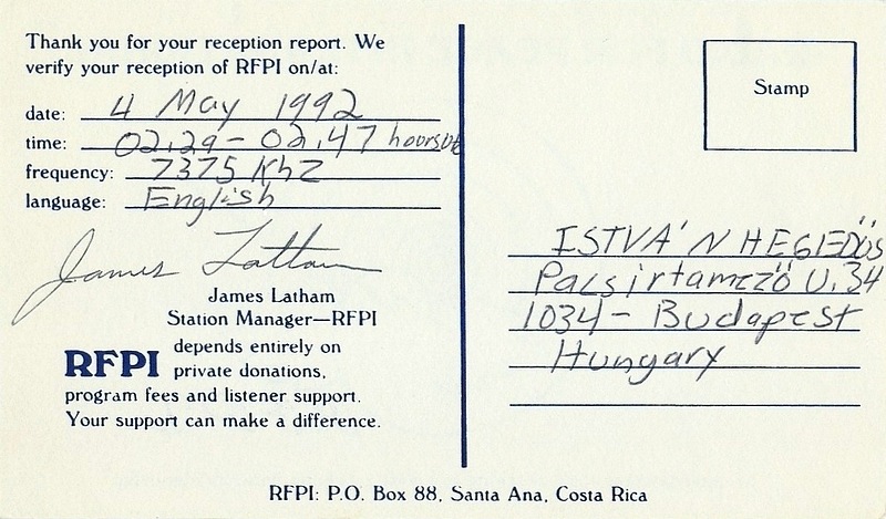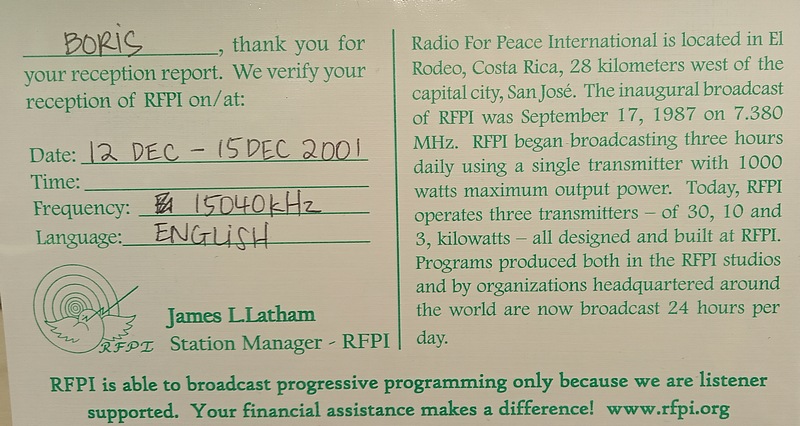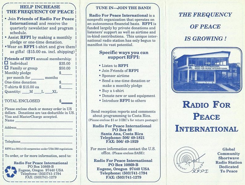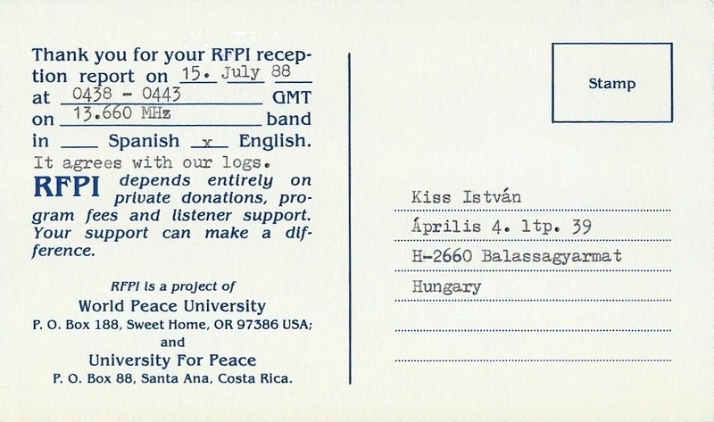 ![]() QSL Contributed by Bill McDavitt (USA) Radio For Peace International - 1992 ![]()