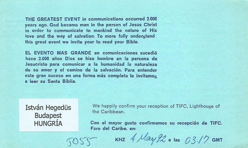 TIFC - Lighthouse of the Caribbean - 1992 ![]() QSL Contributed by Istvan Hegedus (Hungary)