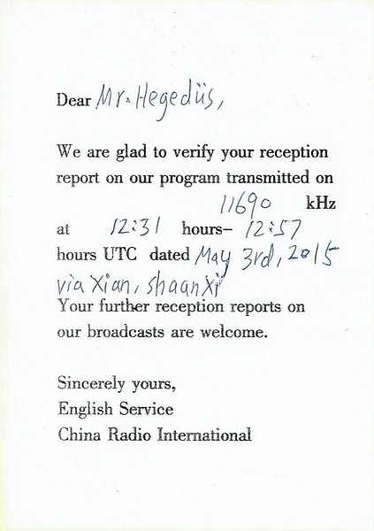 QSL Courtesy of Istvan Hegedus (Hungary)