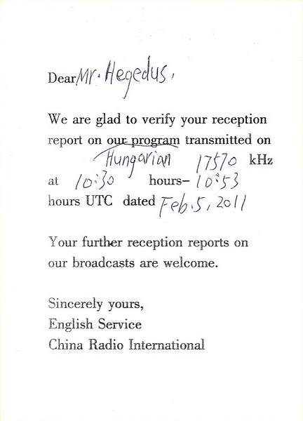 QSL Courtesy of Istvan Hegedus (Hungary)