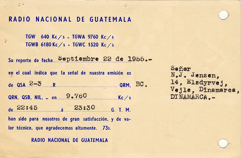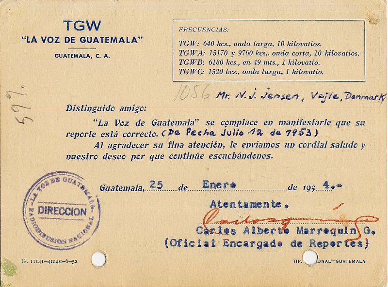 QSL Courtesy of the "Niels J Jensen Collection, Danish Shortwave Club International (DSWCI), Radio Heritage Foundation" Radio Nacional La Voz de Guatemala - TGWA - 1955 ![]() ![]() QSL Courtesy of the "Niels J Jensen Collection, Danish Shortwave Club International (DSWCI), Radio Heritage Foundation" Radio Nacional La Voz de Guatemala - TGWC - 1981