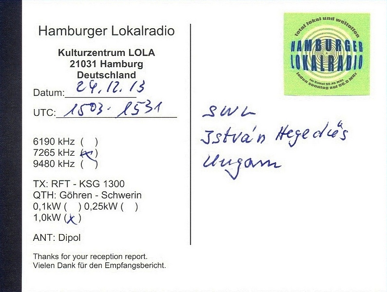 QSL Contributed by Istvan Hegedus (Hungary)