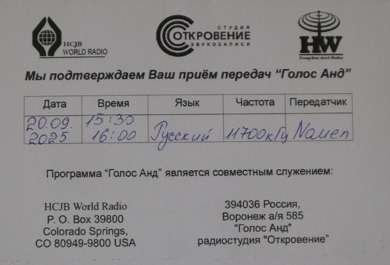 HCJB - Russian Service of Voice of Andes - Nauen, Christmas Card ![]() ![]() QSL Contributed by Ivan Lebedev (Russia) (Translation of QSL Text: He gives a strength to the weary and increases the power of the weak. Isaiah 40 :29)