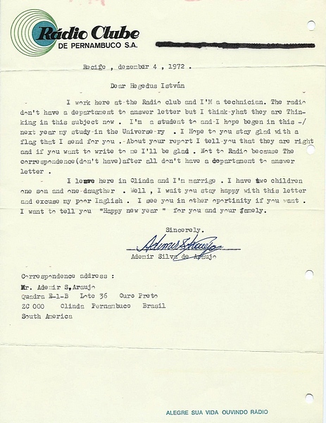 QSL and Sticker Contributed by Istvan Hegedus (Hungary) Radio Clube Pernambuco - 1974 ![]() ![]() QSL Contributed by Istvan Kiss (Hungary)