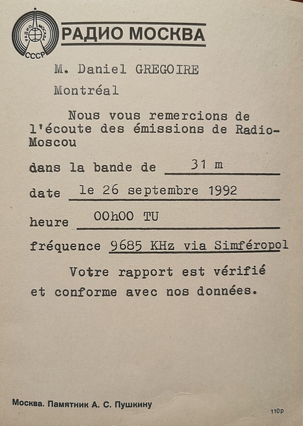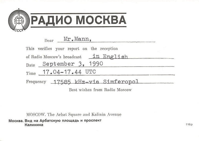 ![]() ![]() QSL Contributed by Carl Mann (USA) Radio Moscow via Simferopol - 1990 ![]() ![]() QSL Contributed by Carl Mann (USA) Radio Moscow via Simferopol - 1992