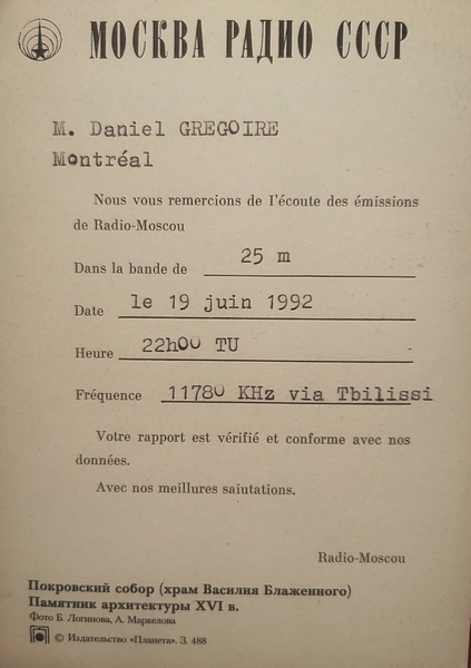 QSL Contributed by Dan Gregoire (Canada)