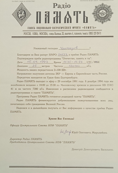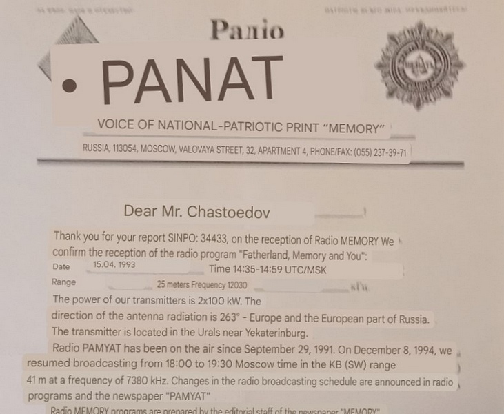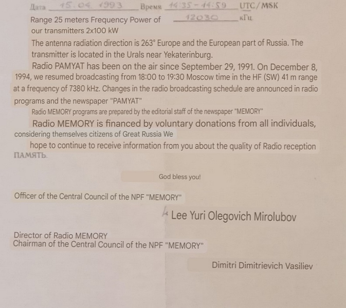 Radio Pamyat (Memory) - Yekaterinburg and Translation - 1993, 1994(2), Station Info Link ![]() ![]() ![]() QSL Contributed by Boris Chastoedov (Russia) Radio Pamyat (Memory) - Yekaterinburg - 1994 ![]() ![]() QSL Contributed by Rudolf Takács (Romania)