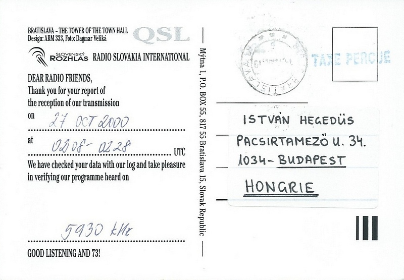 QSL Contributed by Carl Mann (USA) Radio Slovakia International -
