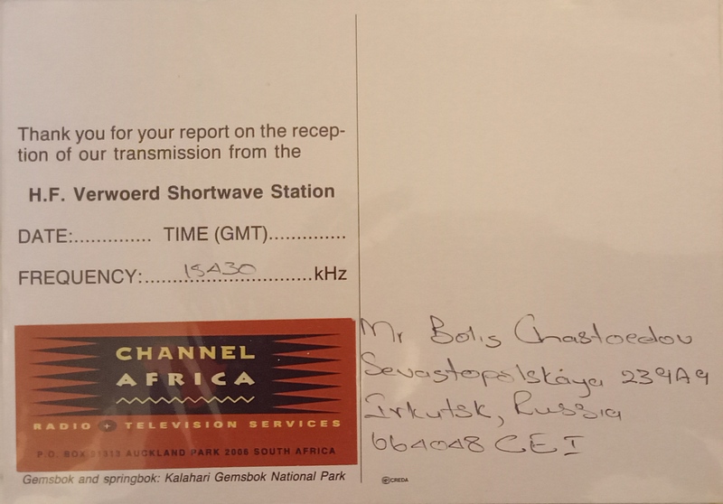 Channel Africa - 2013, Sticker and Audio Recording ![]() ![]() Audio Recording QSL, Sticker and Audio Recording For Reception Report Contributed by Istvan Hegedus (Hungary)