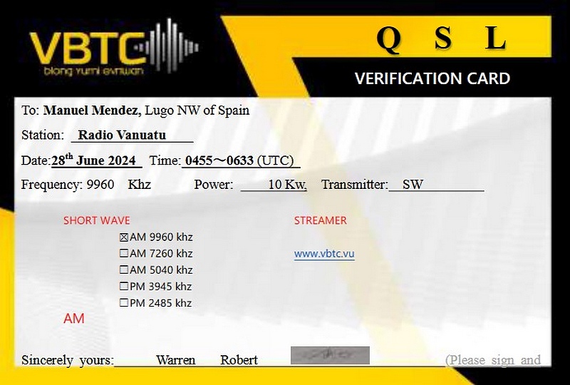 Radio Vanuatu 2023 ![]() QSL Courtesy of Manuel Méndez (Spain)