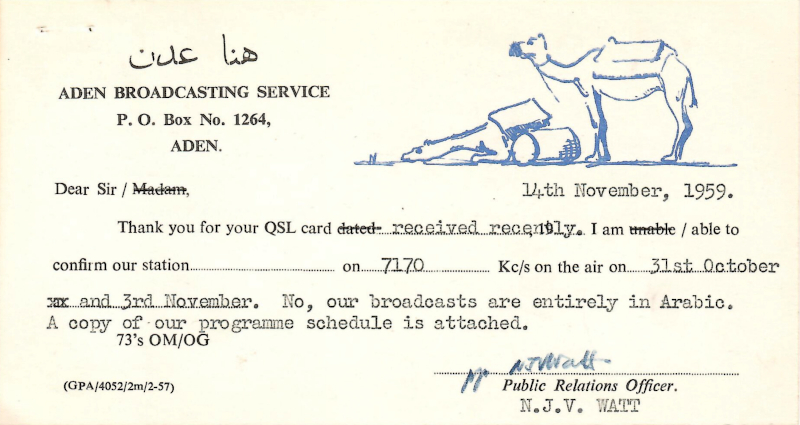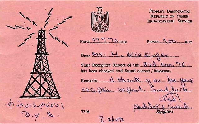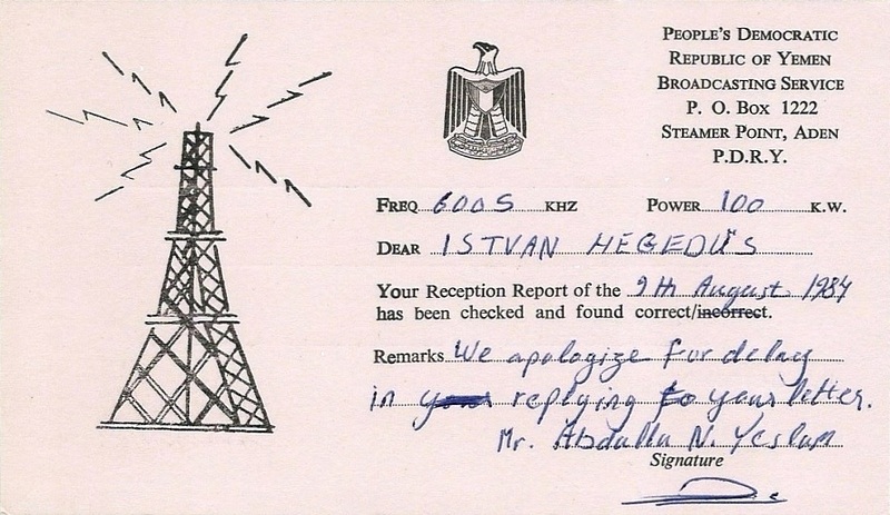 Yemen Broadcasting Service - 1984 ![]() QSL Contributed bt Istvan Hegedus (Hungary)