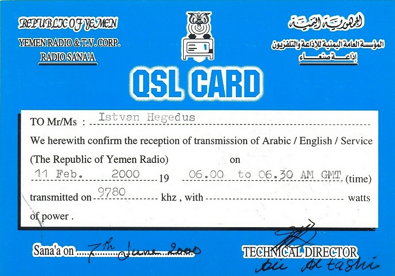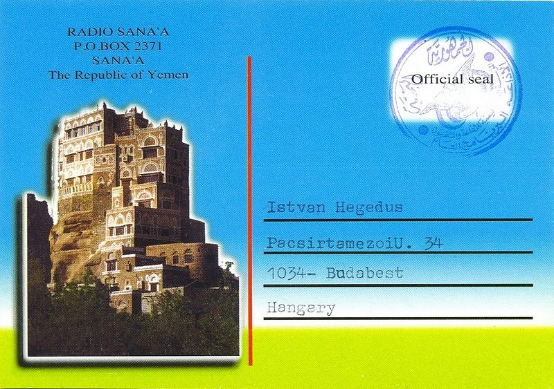 QSL Contributed by Michael Schnitzer (Germany) Radio Sana'a - 1984 ![]() QSL Contributed by Istvan Hegedus (Hungary) Radio Sana'a - 2000