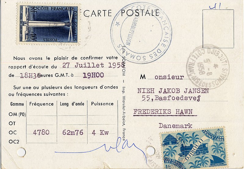 QSL Courtesy of the "Niels J Jensen Collection, Danish Shortwave Club International (DSWCI), Radio Heritage Foundation" RTF - Station de Djibouti