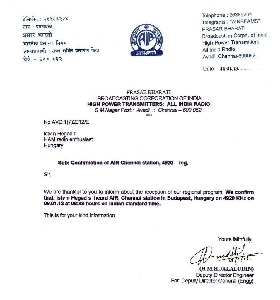 Chennai 2007, 2012, 2013 (Worlds Smallest QSL Card) QSL Contributed by Peter Vaegler (Germany) All India Radio - Chennai - 2012 ![]() QSL Contributed by Istvan Hegedus (Hungary) All India Radio - Chennai - 2013 ![]() QSL Contributed by Istvan Hegedus (Hungary)