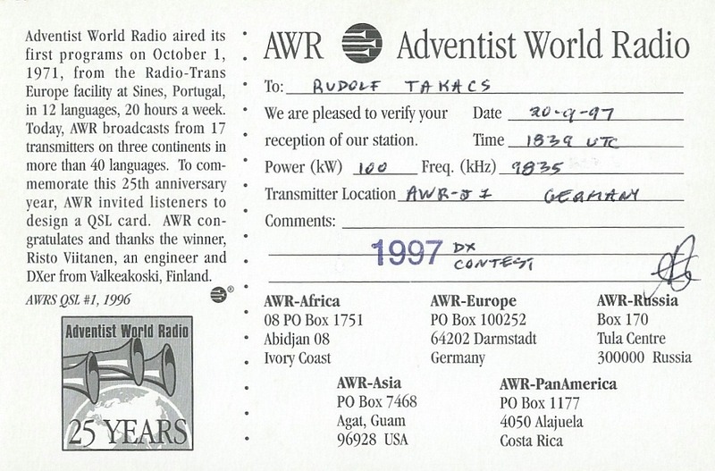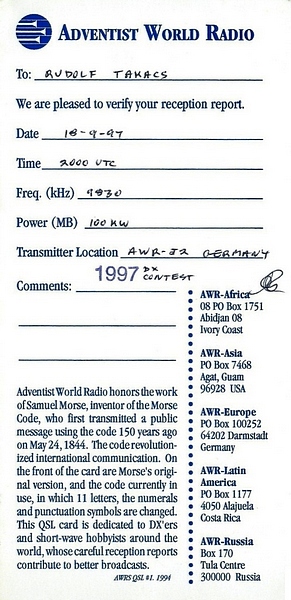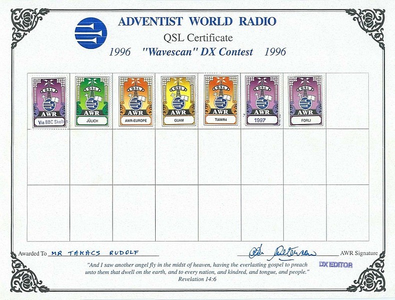 AWR QSL Certificate ![]() Certificate Contributed by Rudolf Takacs (Romania)