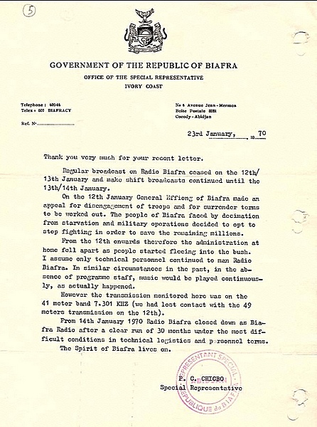 QSL Contributed by Daniel Robinson (USA) Radio Biafra - 1969 QSL Contributed by Michael Mahoney (USA) Radio Biafra - 1969 ![]() Courtesy of “Radio Heritage Foundation, Alvin Sizer” (USA)