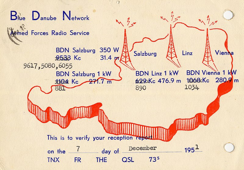 Blue Danube Network - 1951, 1954 ![]() QSL Courtesy of the "Niels J Jensen Collection, Danish Shortwave Club International (DSWCI), Radio Heritage Foundation"