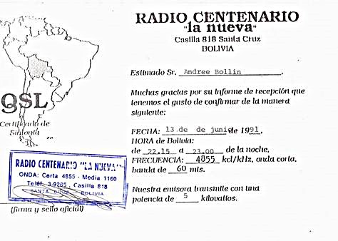 QSL Contributed by Andree Bollin (Germany) Radio Centenario "La Nueva" - 1993