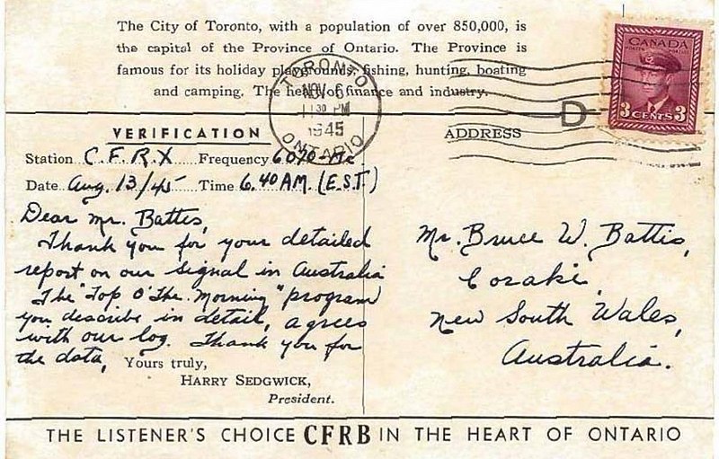 ![]() ![]() QSL Courtesy of "Radio Heritage Foundation, Bruce Battis Collection" (Australia)