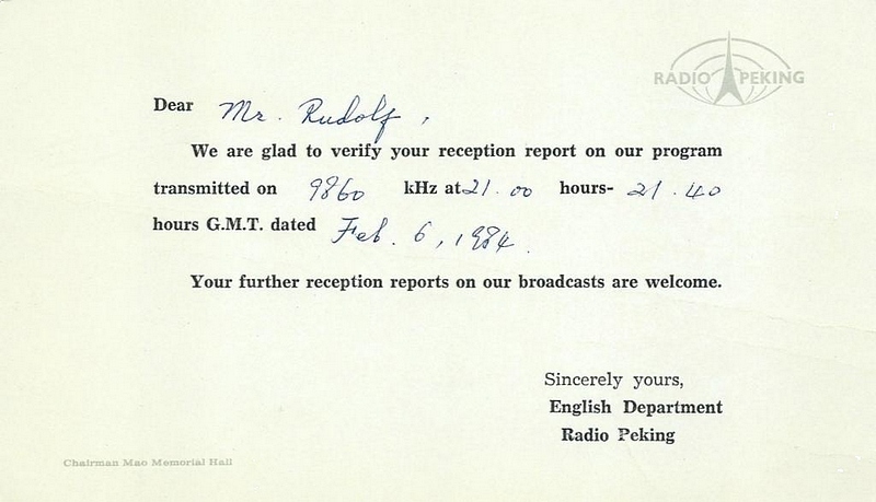 Radio Peking - 1983 ![]() ![]() QSL Contributed by Dan Greenall (Canada) Radio Peking - 1983 ![]() ![]() QSL Contributed by Istvan Hegedus (Hungary) Radio Peking - 1984 ![]() ![]() QSL Contributed by Rudolf Takacs (Romania) Radio Peking - 1984