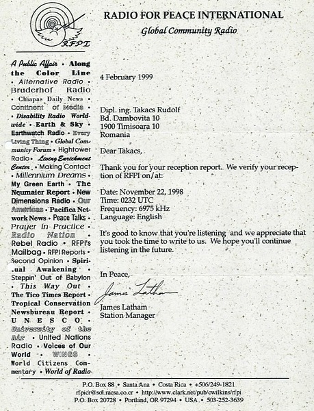 ![]() QSL Contributed by Bill McDavitt (USA) Radio For Peace International - 1992 ![]()