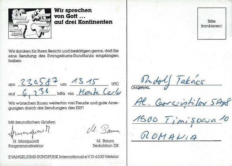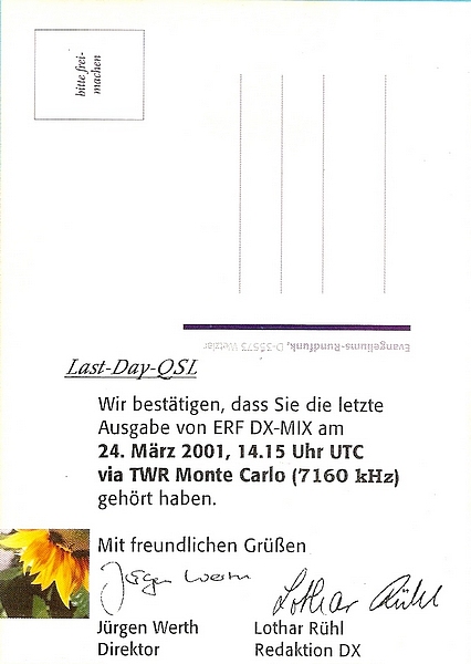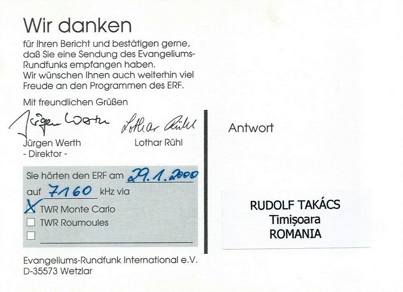 ERF via TWR Monte Carlo - 2001 ![]() ![]() ![]() QSL Contributed by Erich Bergmann (Germany) Sticker Contributed by Rudolf Takács (Romania)