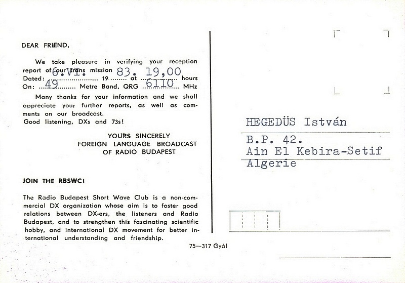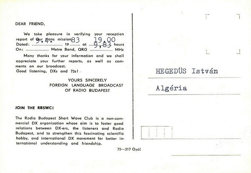 Radio Budapest - 1983 ![]() ![]() QSL Contributed by Istvan Hegedus (Hungary)