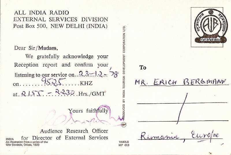 QSL Courtesy of the Les Miles Collection ![]() ![]() QSL Contributed by Istvan Hegedus (Hungary) ![]() ![]() QSL Contributed by Rudolf Takács (Romania) All India Radio External Services - 1974 ![]()