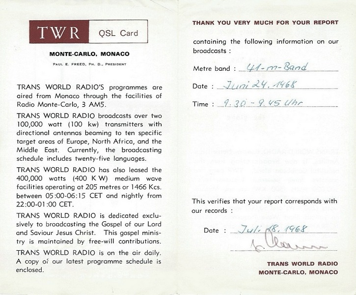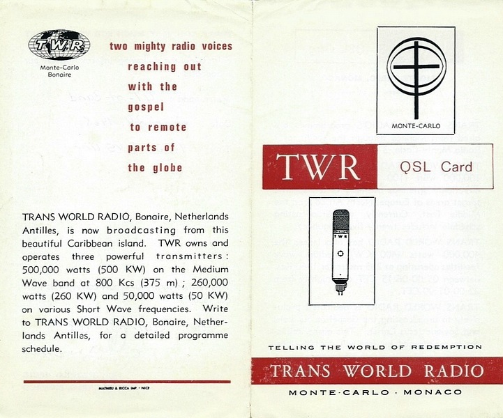 TWR via Monaco - 1982 ![]() ![]() QSL Contributed by Erich Bergmann (Germany)