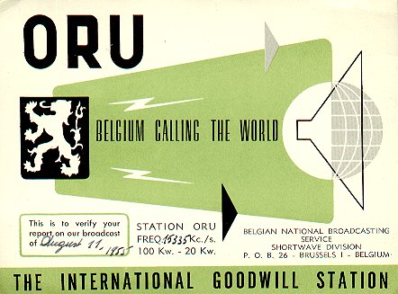 QSL Courtesy of the "Niels J Jensen Collection, Danish Shortwave Club International (DSWCI), Radio Heritage Foundation" Belgian National Broadcasting Service - ORU - 1955 ![]() QSL Contributed by Phil Finkle (USA) Belgian National Broadcasting Service - ORU - 1967