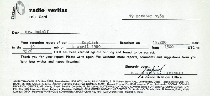 Radio Veritas 1976, 1977(2), 1978, 1985, 1988, 1989(2), 2001, Pennants, Stickers, Prayer Card ![]() ![]() QSL Contributed by Masanori Tomioka (Japan)