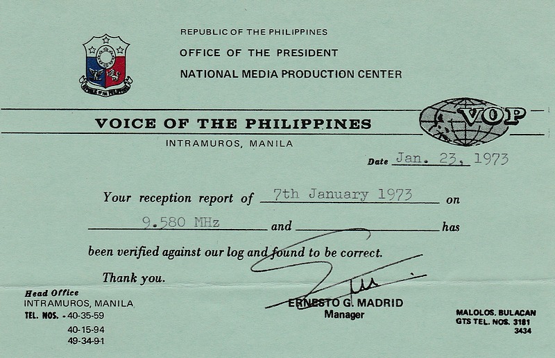 Voice of the Philippines - Radyo Pilipinas - 1975 ![]() QSL Contributed by Masanori Tomioka (Japan)