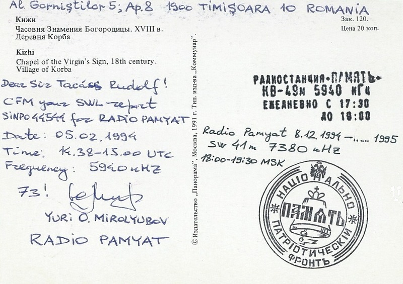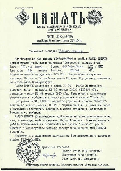 Radio Pamyat (Memory) - Yekaterinburg and Translation - 1993, 1994(2), Station Info Link ![]() ![]() ![]() QSL Contributed by Boris Chastoedov (Russia) Radio Pamyat (Memory) - Yekaterinburg - 1994 ![]() ![]() QSL Contributed by Rudolf Takács (Romania)