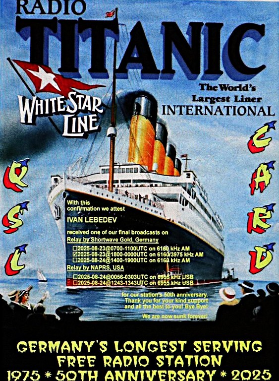Station Information - The never-ending story finally comes to an end: "Germany's longest-serving free radio station," RADIO TITANIC INTERNATIONAL, which last contaminated the airwaves with its free radio programs 25 years ago, is back on shortwave for you, offering you the unique opportunity to hear the station again, or rather for the first time. Thanks to the outstanding service provided by the makers of Shortwave Gold and shortwaveradio.de, who gave us the opportunity to celebrate this unique comeback of RTI via their transmitters! The station was active on various pirate radio frequencies from 1975 to 2000 – some old-timers may still remember this – and is now celebrating its unique comeback on shortwave exactly 50 years after its broadcasting launch in August 1975. In the first 25 years of its existence, RTI broadcast more than 250 times with its own transmitters and those of its friends, and sent out more than 1,500 printed QSL cards during that time. In addition to a current programme segment, there will be a retrospective of RTI's station history, as well as various recordings from almost all of the DJs who were hired on the broadcasting ship TITANIC at the time. The program blocks will be in German, English, Swedish, and Spanish, among others, hosted by all the DJs who contributed announcements and programmes in the years before the millennium. We would like to express our sincere gratitude to all our friends and many helpers; without your enthusiasm, this project would never have survived 25 years! Station founder Mark Brown