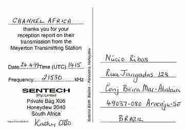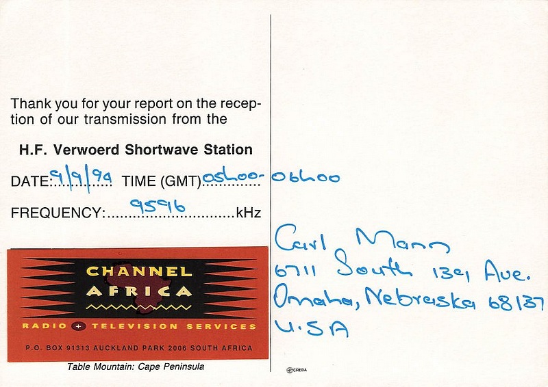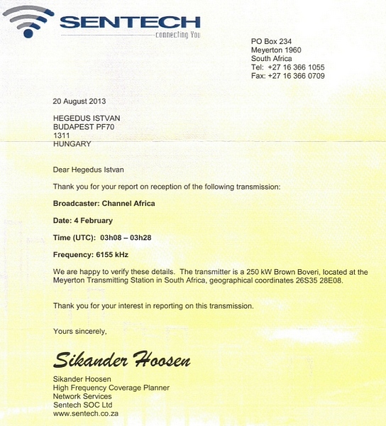Channel Africa - 2013, Sticker and Audio Recording ![]() ![]() Audio Recording QSL, Sticker and Audio Recording For Reception Report Contributed by Istvan Hegedus (Hungary)