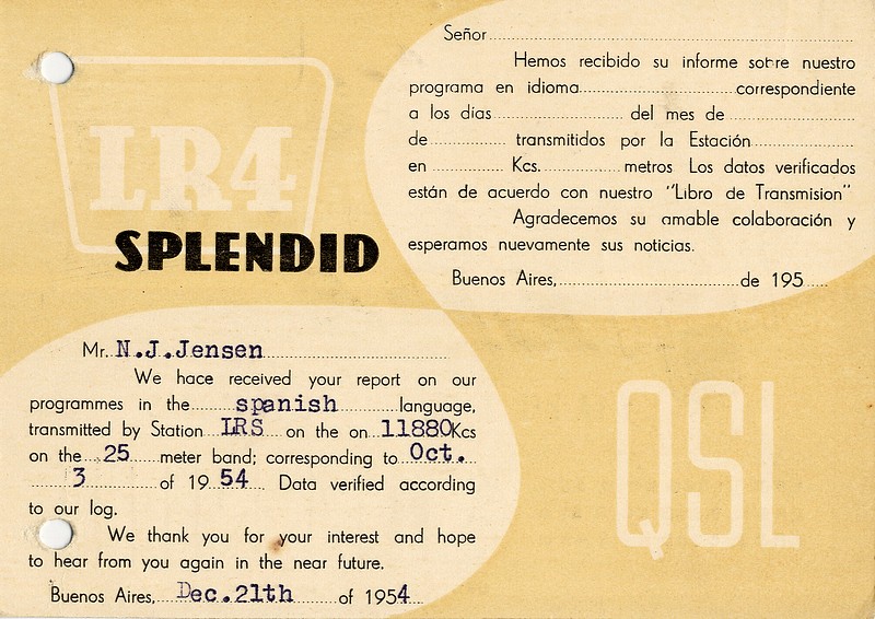 QSL Courtesy of the "Niels J Jensen Collection, Danish Shortwave Club International (DSWCI), Radio Heritage Foundation" Radio Splendid - LR4 - 1964 ![]()