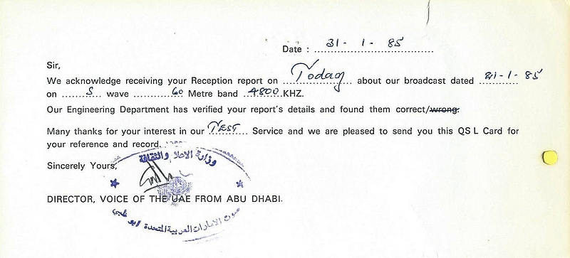 Voice of the UAE From Abu Dhabi - 1994 ![]() QSL Contributed by Boris Chastoedov (Russia)