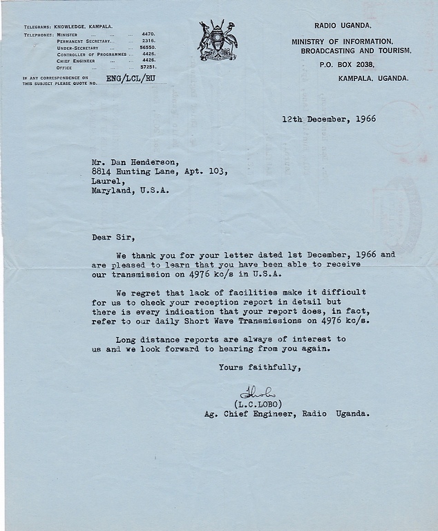 Uganda Broadcasting Corporation - 1978 QSL Contributed by Bill McDavitt (USA)
