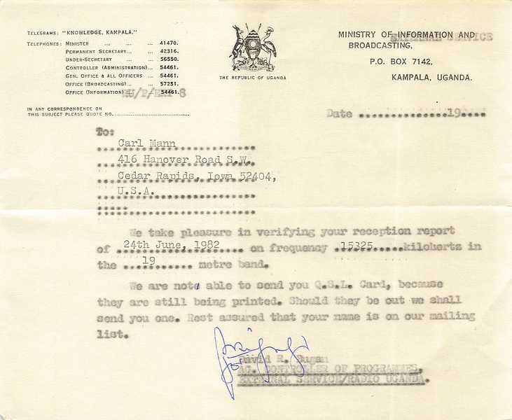 Uganda Broadcasting Corporation - 1983 ![]() ![]() QSL Contributed by Istvan Hegedus (Hungary)