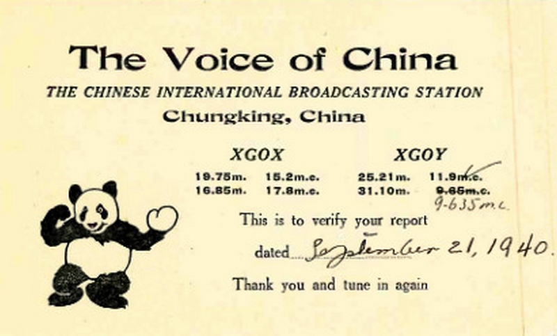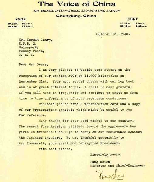 XGOY - Central Broadcasting Station - Chungking, 1939, 1940, Letter