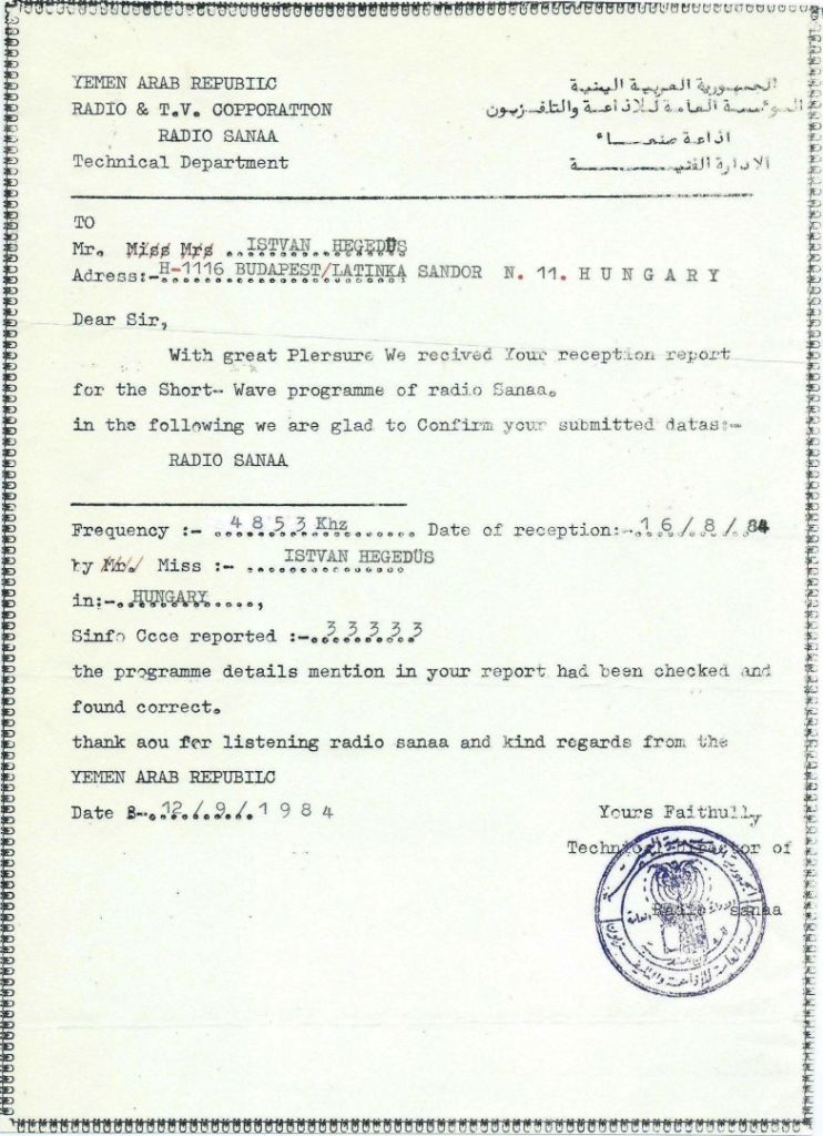 QSL Contributed by Michael Schnitzer (Germany) Radio Sana'a - 1984 ![]() QSL Contributed by Istvan Hegedus (Hungary) Radio Sana'a - 2000